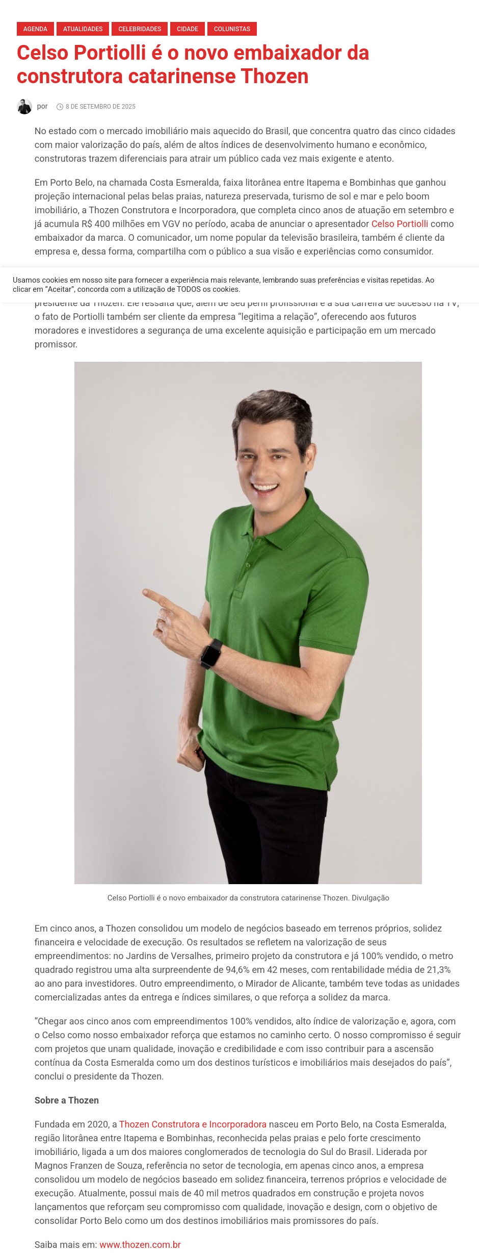 Celso Portiolli é o novo embaixador da construtora catarinense Thozen